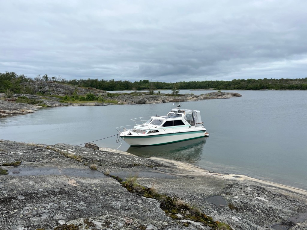 Viiden aikoihin heräsin uudelleen, kun tuuli oli muuttanut suuntaansa ja vene käyttäytyi eri tavalla. Menin ulos katsomaan ja vaarallisen lähellä kalliorantaa keula seilasi edes takaisin. Yritin muuttaa keulaköysien/liinojen kireyttä, mutta tuuli painoi todella voimakkaasti takaviistosti. Köysiä räplätessäni ankkuri ihan selvästi antoi jonkin verran periksi. Yritin ankkuriköyttäkin kiristää, mutta ei vain jaksanut. Kun on koko ikänsä puku päällä kynä kädessä töitä tehnyt, ei vain voimat riittäneet. Ei jäänyt muuta vaihtoehtoa, kuin purkaa kaikki keulaköydet ja springit pois. Siinä vaiheessa kun viimeinen köysi oli kädessäni, tuuli melkein riisti veneen käsistäni. Jouduin oikeesti hetken nykimään, että pääsin hyppäämään veneeseen liukkaalta ja märältä kalliolta.