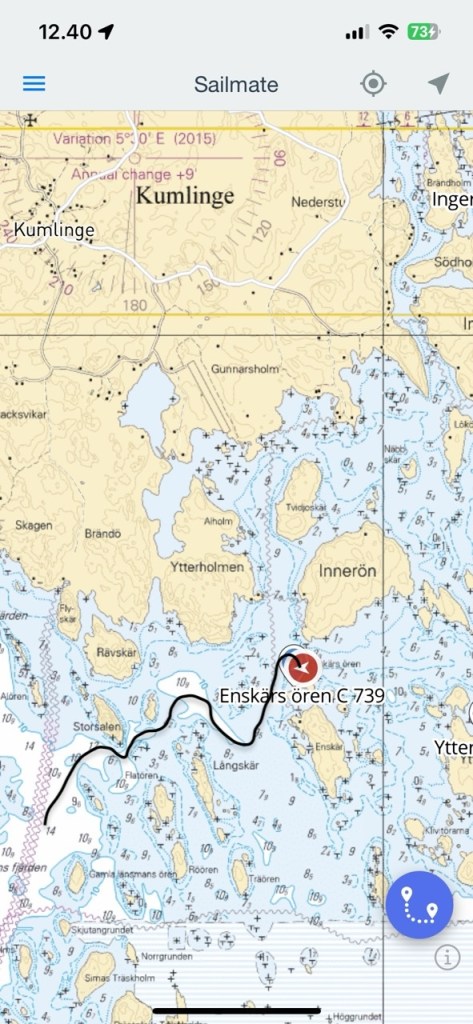 Aamupalan jälkeen päätettiin vaihtaa maisemaa. Osittain kaapelinjaa seuraten sekä loppumatka partiolaisten oikaisureittiä pitkin löydettiin Enskärs ören. Partiolaiset ovat kertoneet tarkan paikan, mihin kannattaa mennä maihin. Ja tosiaankin, saaren paras rantautumiskohta.