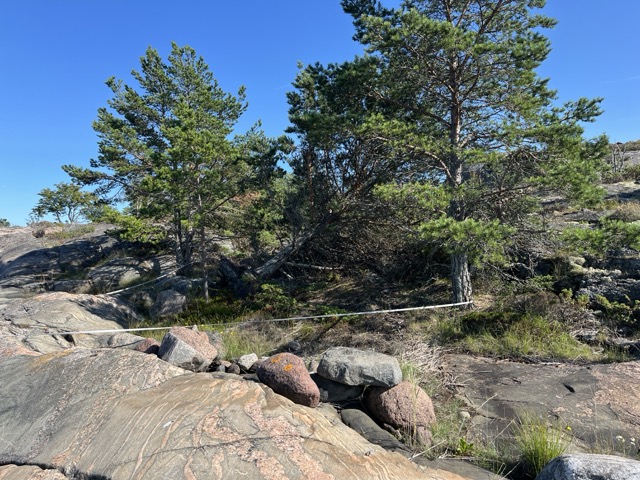Siinä on esimerkiksi mainuttu nämä rantamännyt ja kalliotasanne keulamme kohdalla.