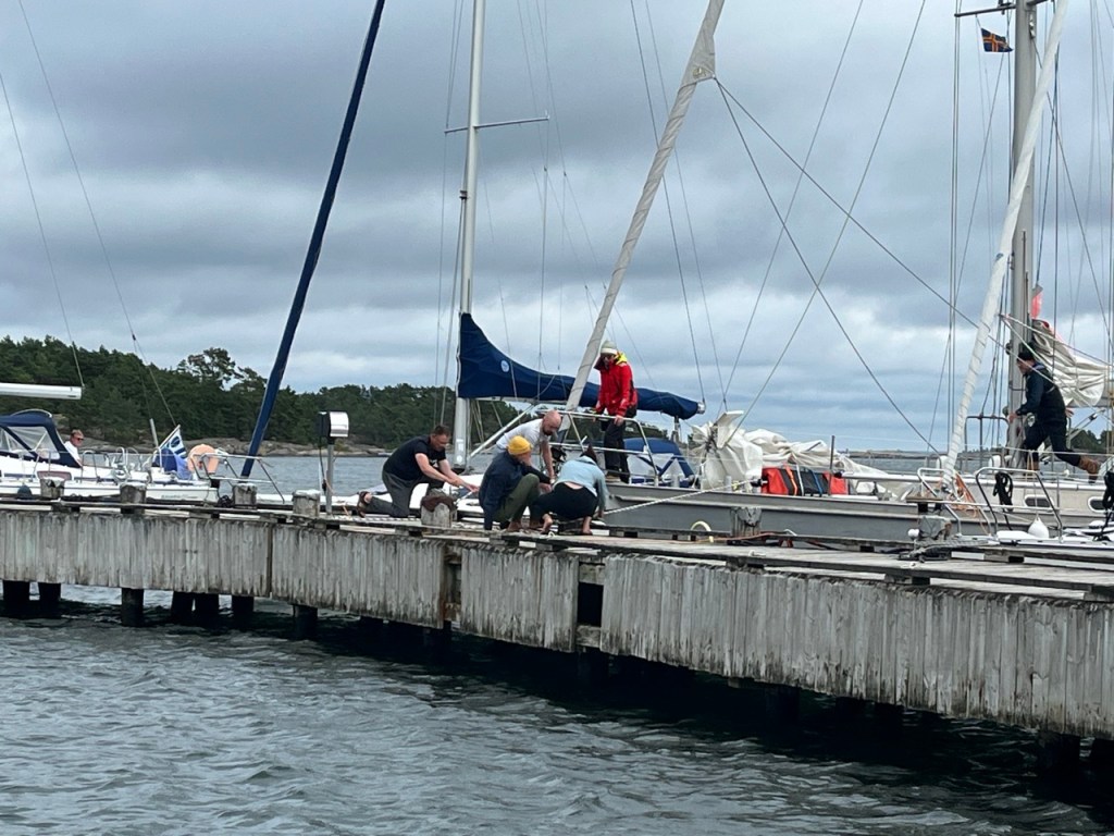 Pari tuntia ruotsalaisten lähdön jälkeen tuli uusi purkkari. Laiturilla oli melkoinen kuhina, että saivat ison veneen kiinnitettyä. Onneksi on auttajia.