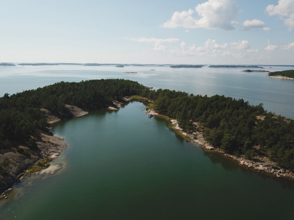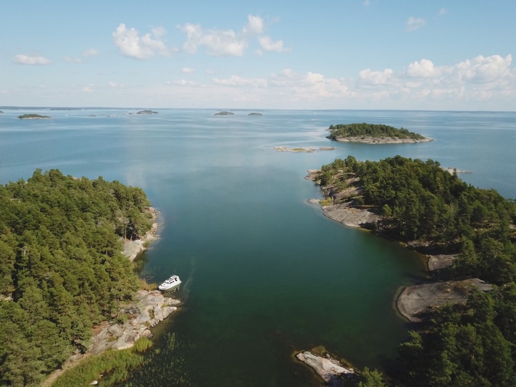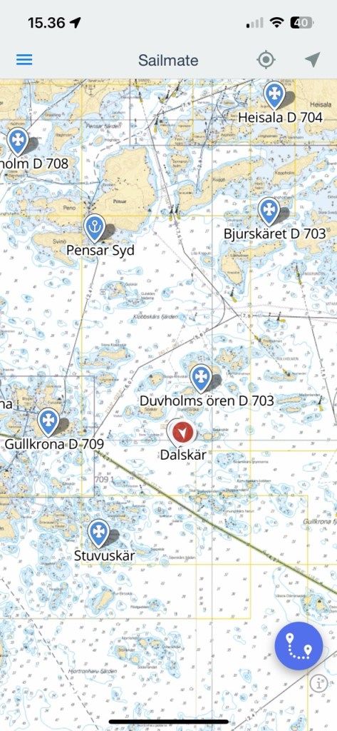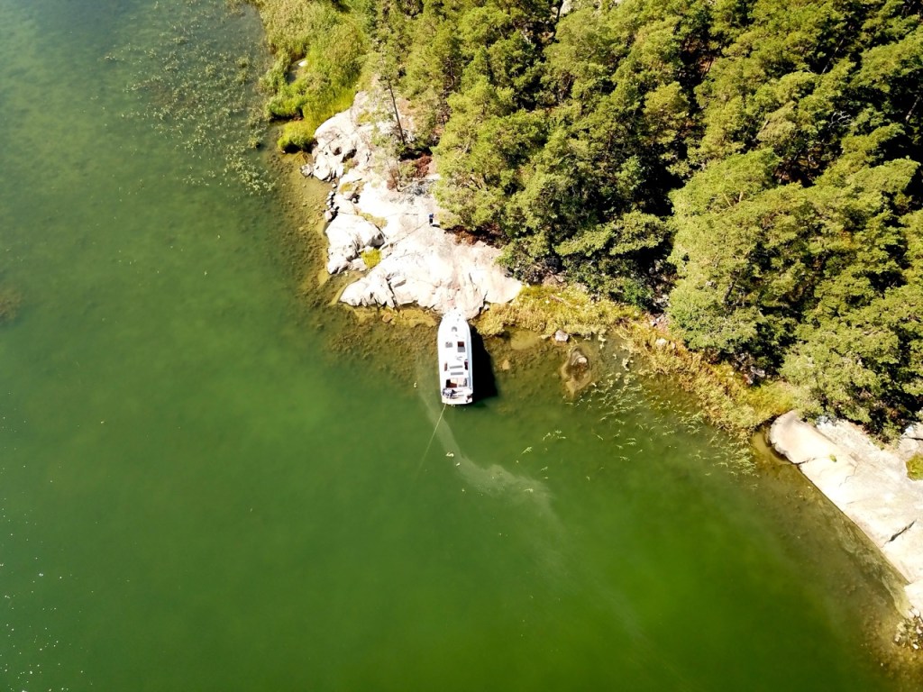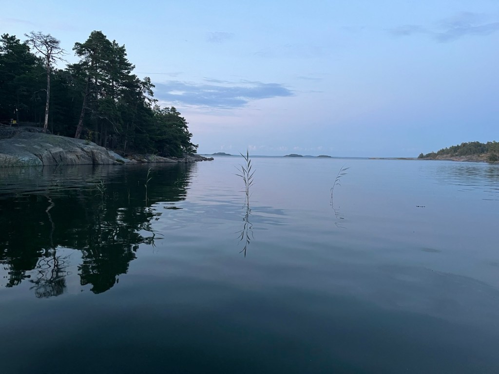 Eilisen myräkän jälkeen päätettiin lähteä tuulilta suojaisaan paikkaan, Dalskäriin. Kuva on itään päin, joten jos sieltä puhaltaa, voi täällä keinuttaa.