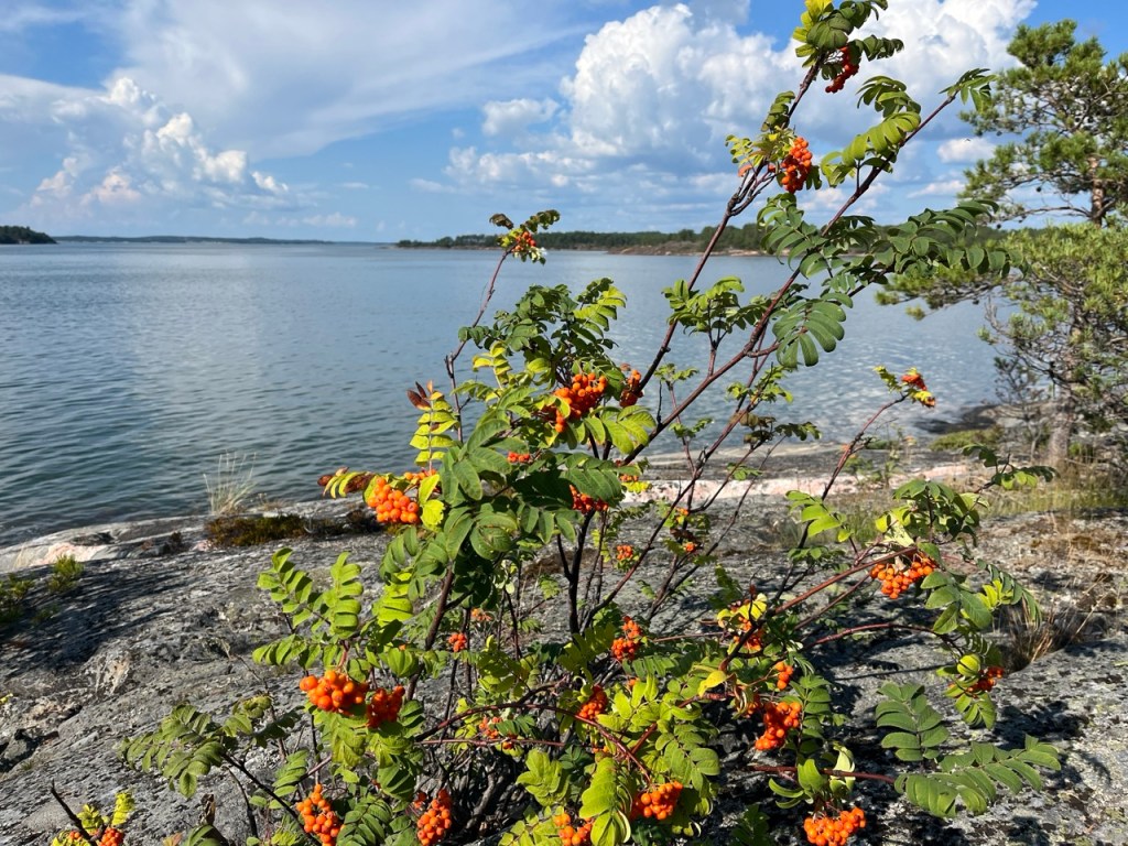 Lenkilläkin helteestä huolimatta kävimme. Kuva itäkärjen korkeimmasta kohtaa. Saari joka näkyy korkeana, on Bolanskär. Olemme siellä olleet viime kesänä, kun täällä oli tunkua. Se onkin kiva saari, mutta nyt tämä länsituuli olisi siihen tuonut laineita ikävästi. Emme halunneet keinua koko yötä. Ennusteissa kerrotiin, että se voi tuulla koko yön.