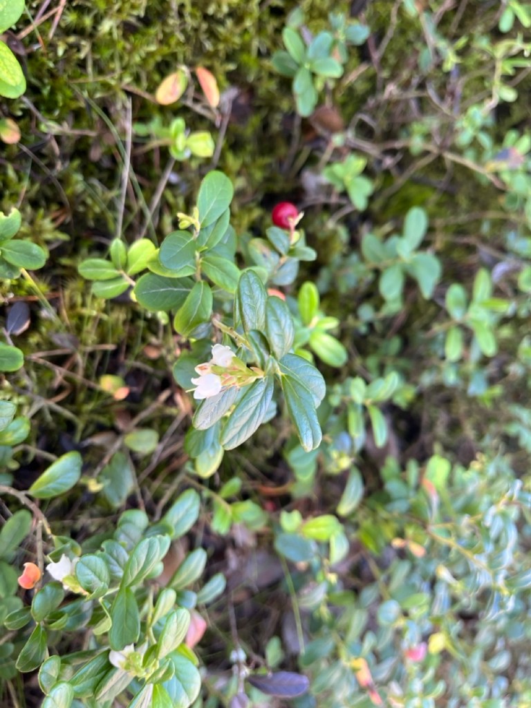 Vähän ennen satamaa tien varressa oli puolukka niin kukassa kuin marjassa. En muista nähneeni aikaisemmin tällaista.