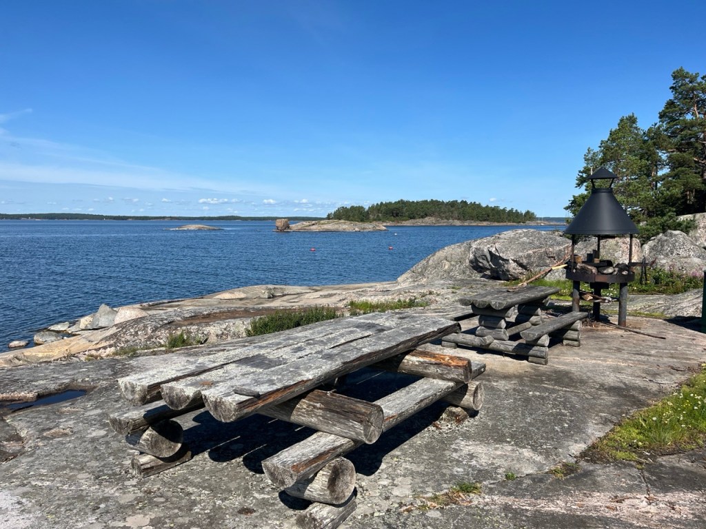 Länsirannan puolella on ruokailuryhmä ja grillauspaikka. Tiedoksi niille, jotka saarella eivät ole käyneet. On meidän veneekin lähellä oikein grillikatos, wc ja paljon kuivia puita.