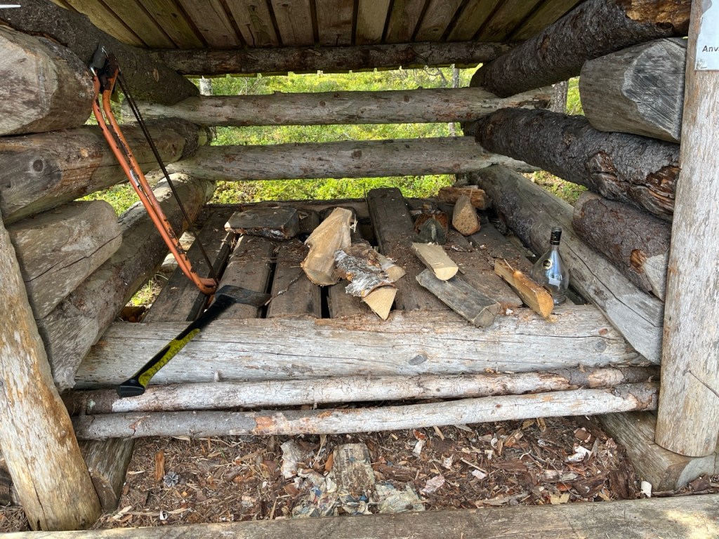 Polku itään päin ja siinä olevan nuotipaikan sen jäljellä olevat puut on heti reittimme varrella. Juuri ja juuri yhdet makkarat sais poltettua.