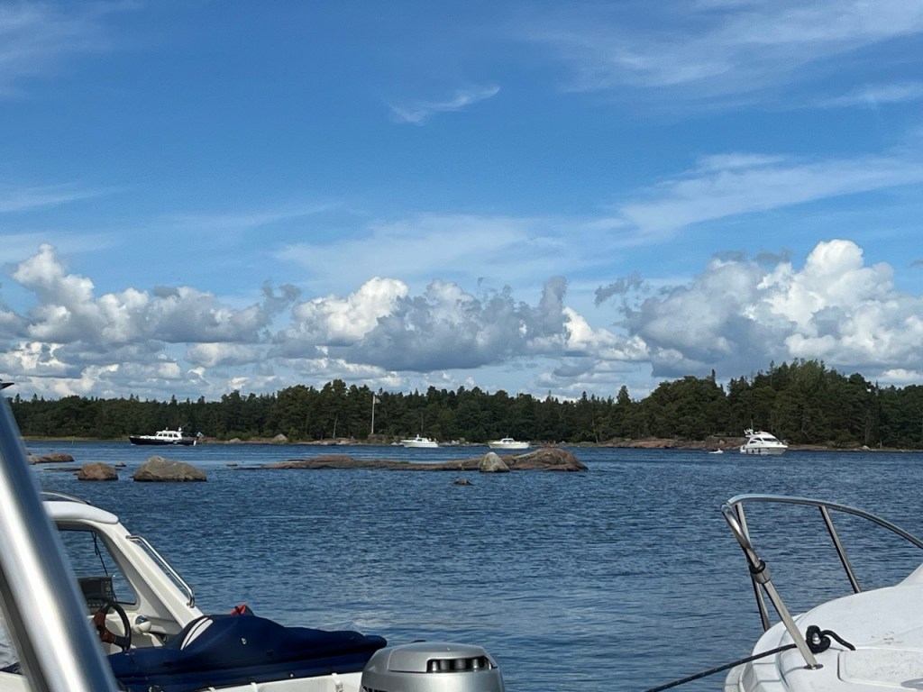 Jossain vaiheessa ihmettelin kun puutarhaväylän kapeassa kohdi yksi vene pyörähti ympäri ja sitten muodostui jono. Hetken päästä syy selvisi. Kuvan oikeassa reunassa oleva iso moottorivene oli tulossa lännestä, jolloin muut joutuivat odottamaan että se pääsee tulemaan kapeimmasta kohdin tehden muille tilaa jatkaa matkaa.