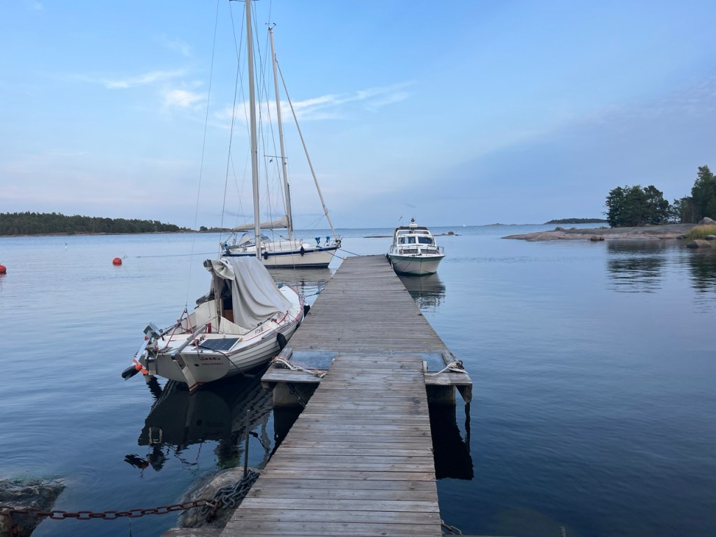 Alkuillasta pari pienempää venettä kävi piipahtamassa saaressa. Laiturin vasemmalla puolella perä edellä oleva purjevene on folkkari, Kansanvene. Secco merkiltään ja lasikuidusta tehty. En tiennytkään että niitä on kuidusta tehty. Näytti todella siistiltä. Voi kun olisi vielä parikymppinen pojan koltiainen ja tuollainen olisi.