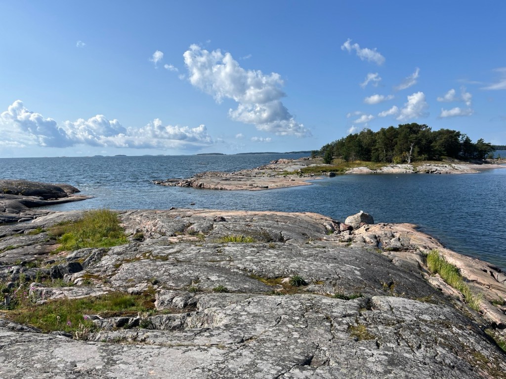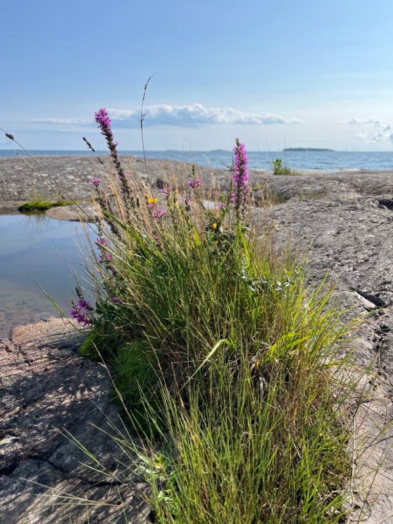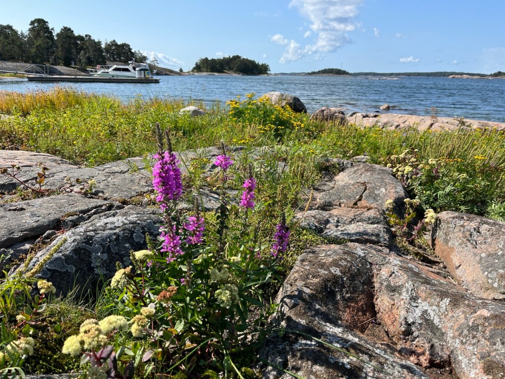 Kukat ja meri. Tällä puolen saarta näin pienen rantakäärmeen, mutta hävisi kivikkoon ennen kuin sain kännykäkameran esille. Oli hivinen lyijynää isompi.