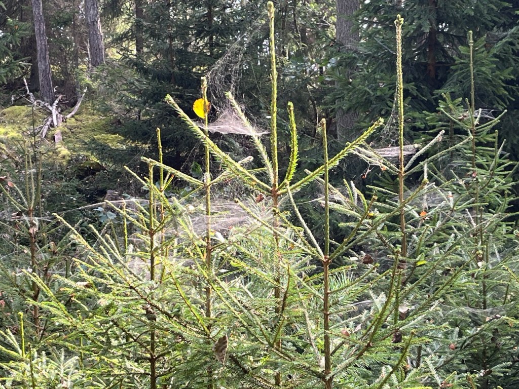 Kun auringonvalo osuu oikeassa kulmassa kuusen taimiin, tuli seitit hienosti näkyviin.