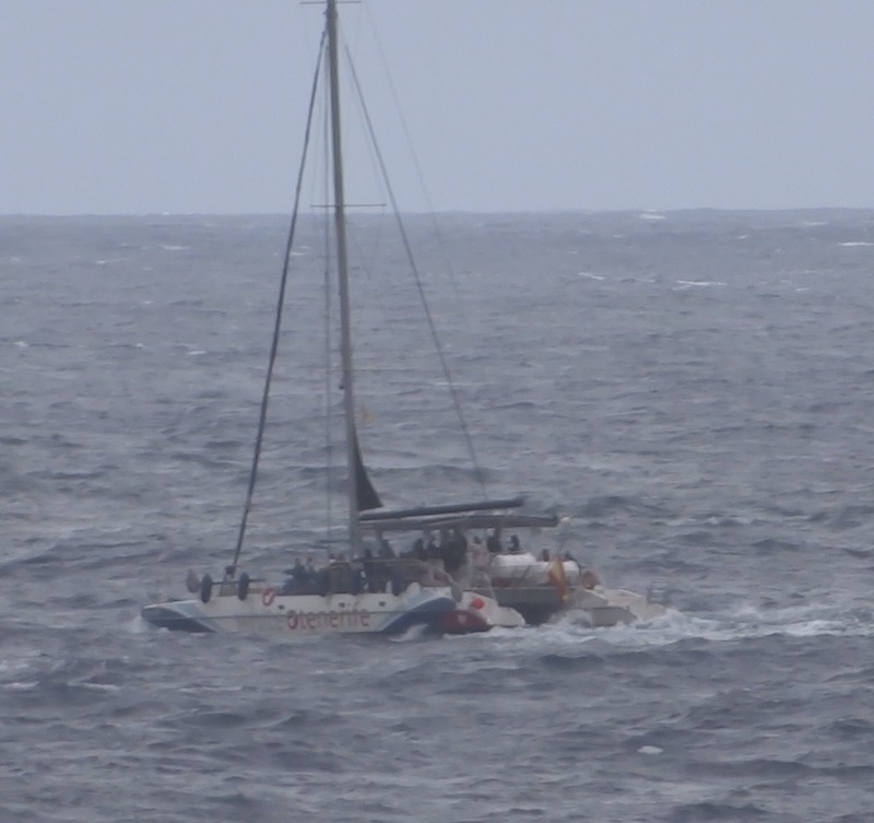Tuuli oli merellä melkoinen. Osittain vaahtopäiset aallot ja navakka tuuli ei näköjään antanut turisteille oikeaa purjehduskokemusta. Koneella ajelivat. Kookas katamariini nyökkäili aaltojen välissä käyden välillä melkein näkymättömissä. Edellisenä päivänä tuli puhelimiimme varoitus ulkoministeriöltä, varoittivat myrskytuulista Espanjassa, pois luiken kanarian saaret. Ilmeisesti tämä tuuli oli sen myräkän ulkoreunoja?