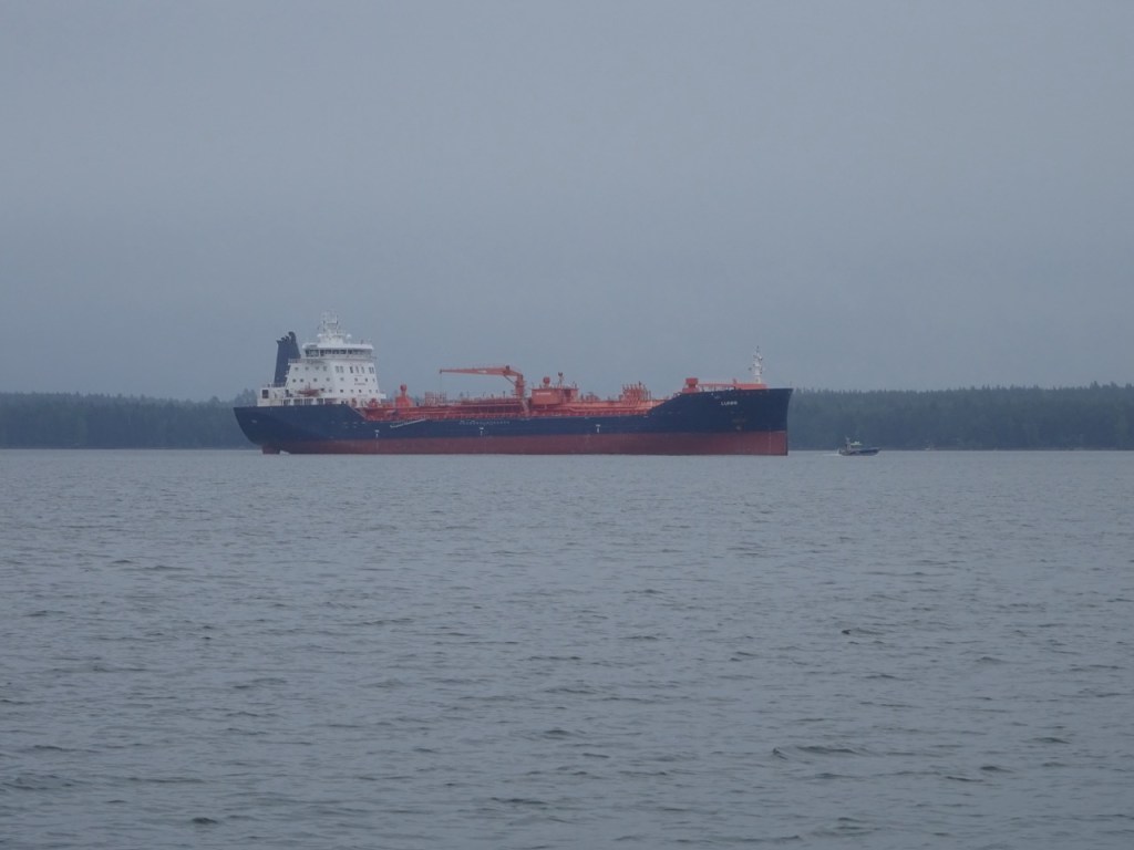 Söldvikin jalostamon kohdalla redillä olleeseen laivaan taisi nousta luotsi, kun kutteri kävi piipahtamassa sen kyljessä.