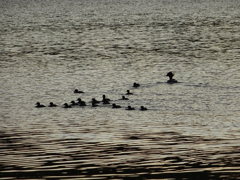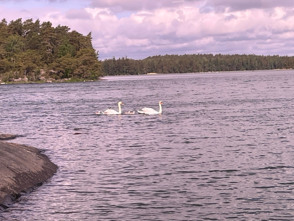 Aamulla joutsenperhe purjehti ohitsemme. Tuossa vaiheessa ei vielä tuullut paljon.