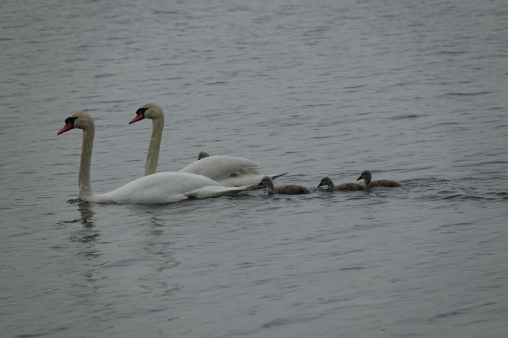Joutsenperheellä yksi neljästä poikasesta oli kaiketi väsynyt, kun oli mennyt äipän siipiensuojaan kyytiin.