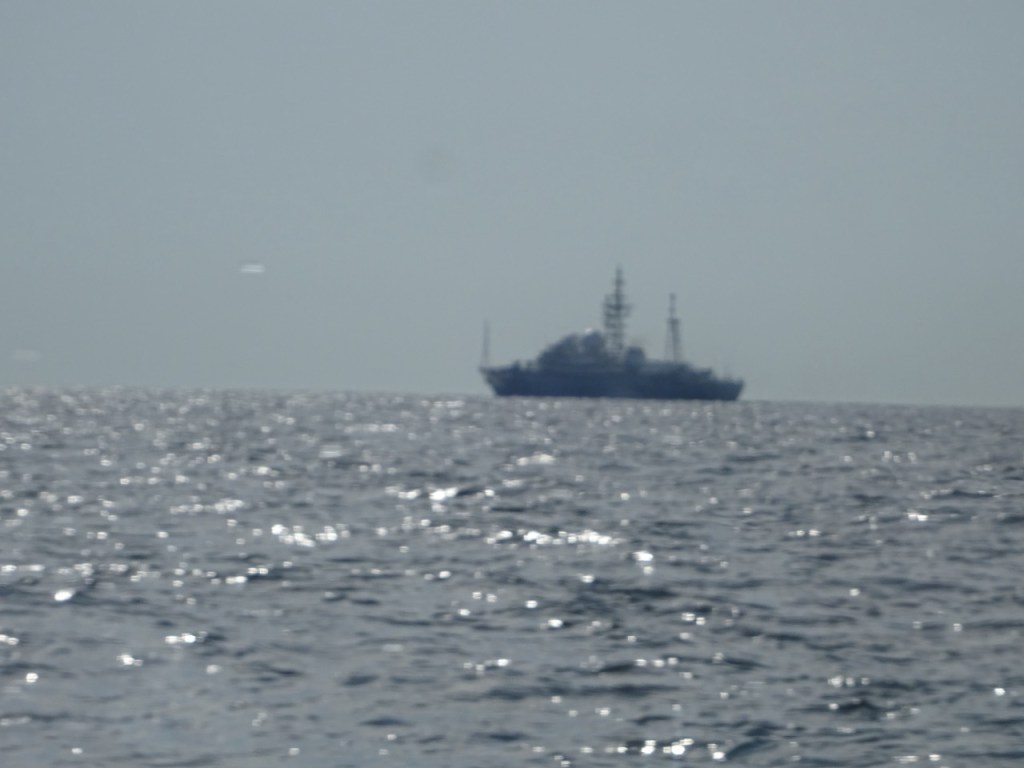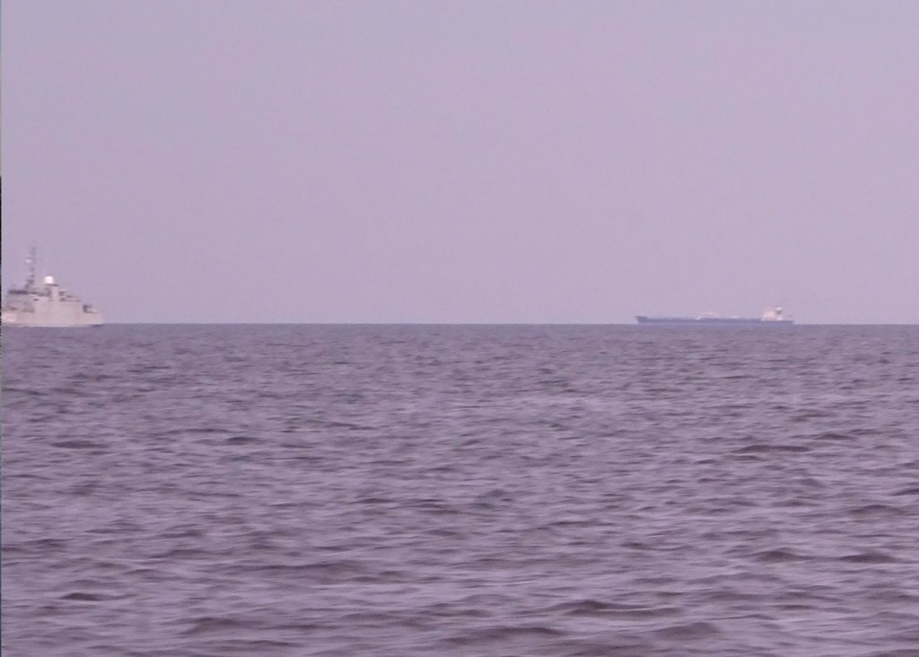 Rahtilaiva ja sotalaiva mahtuivat nippa nappa samaan kuvaan. Heiluvassa veneessä kuvaaminen hiukan haastavaa.
