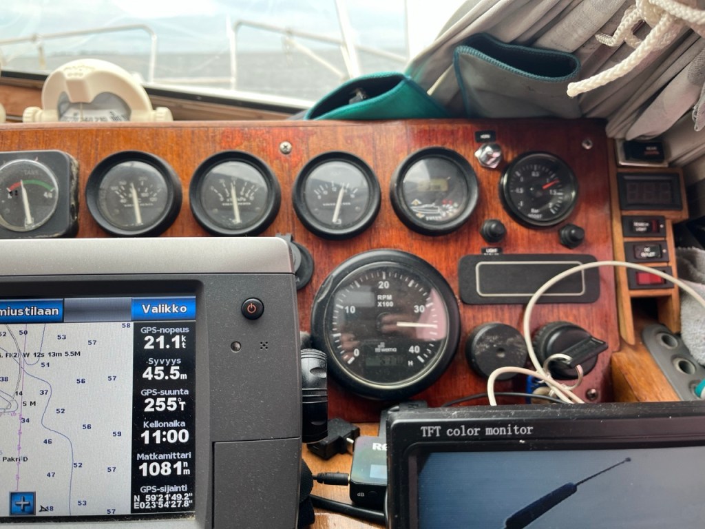 Välittömäsi kun pääsimme Porkkalan saariston suojasta pois, alkoi aallokko. Sen verran oli kookkaita, että piti hidastaa vauhtia ja trimmata keula alas. Pahimmoilleen oli melkein metristä vastapattia.