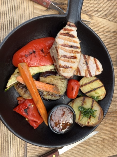 Näistä paistinpannuista oli pikkaisen hankala syödä. Varmaankin annos olisi säilynyt pitkään lämpöisenä valuraitaisissa pannuissa, mutta kun niitä ei oltu lämmiteety juuri lainkaan. Eli siinäkin väräh ”ryssitty” koko hieno idea. Kuvittele syöväsi syvältä, isolta keittolautaselta. Ei ollut mielestäni hyvä idea. Ravintoloitsija arvatenkin eri mieltä.