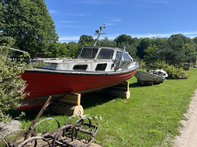 Jonkun matkan päässä talon ja tien vierutalle laitettu venenäyttely. Nämä kulkupelit ovat työsä tehneet ja päässeet viettämään hyvin ansaittua eläkettä. Ihan kuten ohikulkijatkin, jotka tämän ikuisti 😉