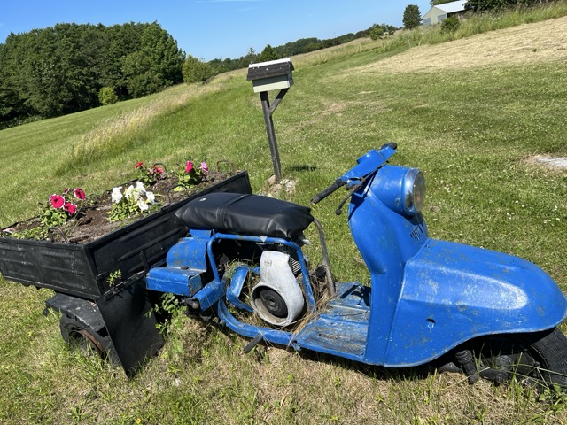 Ikivanha skootteri oli saanut uuden tehtävän. Ilmeisesti ollut aikoinaan peräkärrin vetojuhtana. mutta uupunut liian painaman kuorman ”alla”.