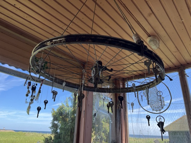 Kivoja pieniä yksityiskohtia sisustuksessa. Vanha pyörän vanne ja siinä roikkuvat avaimet. Onko niin että siitä saa etsiä jos oma hukassa 😉