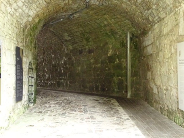 Valtavan paksun muurin läpi johtaa kapeahko mutta ennen kaikke matala tunneli.