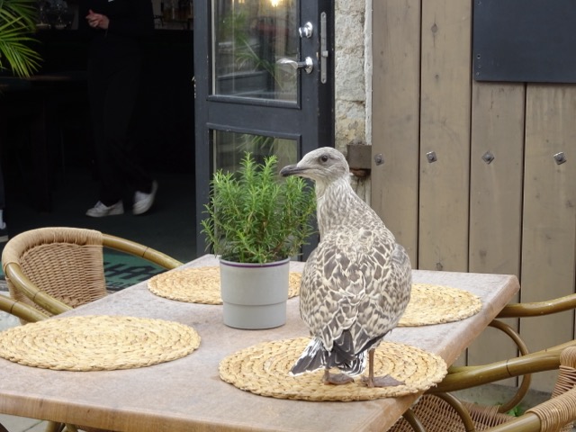 Juuri kun olimme tilanneet ruuat, tuli lokin poikanen viereiseen päytään. tiesikö että kohat saa ruokaa 😉 Henkilökunta ei oikein uskaltanut hätistellä sitä pois, mutta kun nousin seisomaan, lähti heti liihoittaen pois.