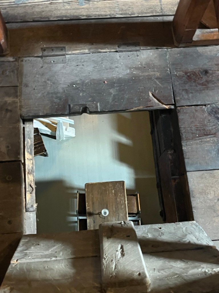 Tuosta reijästä se meni alempaan kerrokseen, jossa on sali.