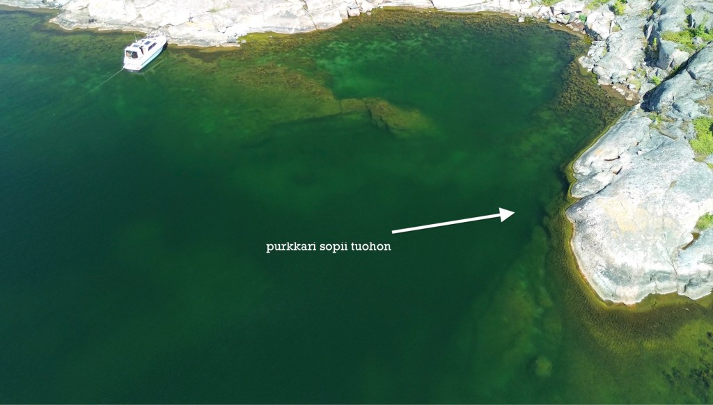 Paikka ei välttämättä sovi köliveneille, koska on kuitenkin aika matalaa tässäkin. Perän kohdallakin vain parimetriä vettä.