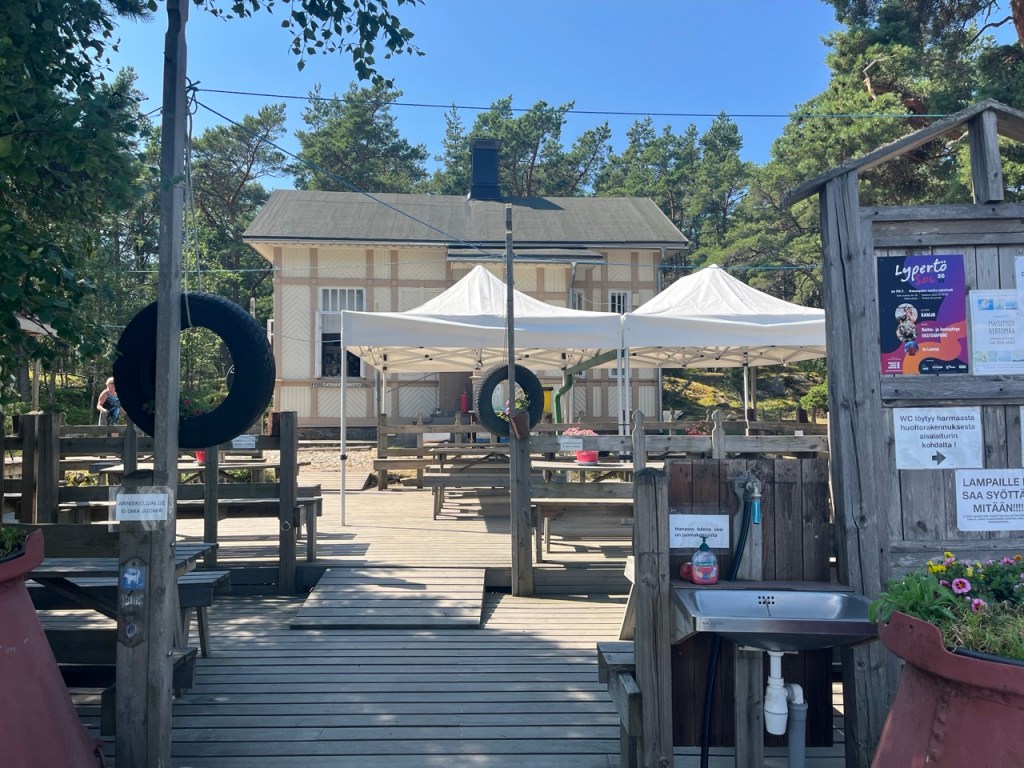 Kahvilaravintola toimii myös satamatoimistona. Iso terde edessä.
