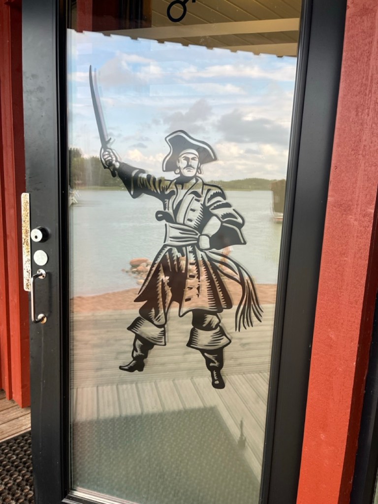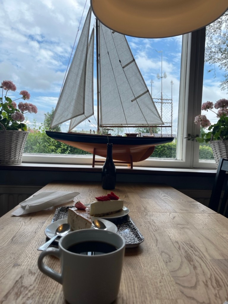 Tämän paikan herkulliset leivonnaiset, nam… Porukkaa oli tosi paljon. Terassi sekä sisätilat melkein täisiä. Saimme kuitenkin sisältä toiseksi viimeisen päydän. Ikkunan takana näkyy juhannussalko. Paitsi luulempa ettei ole sellainen? Keskisalossa purjeveneet pyörivät tänään aika vinhaan.