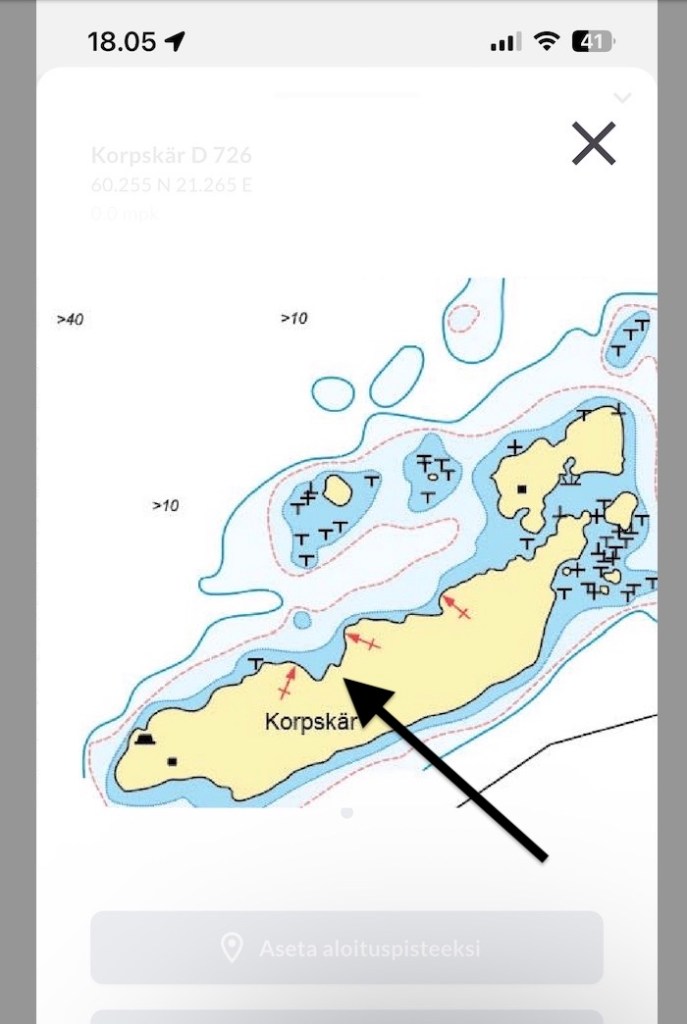 Partiolaisten ohjeista poiketen, rantauduimme suosituskohteiden puoliväliin. Nuo punaiset sopii vaikka purkkarille, mutta meidän kohdalla vain moottoriveneille. Vaikka perässä onkin pari metriä vettä, on keulan alla loiva kohta. Lisäksi meidän kohdalla kallio on loivempi. Sopii vanhuksille paremmin.