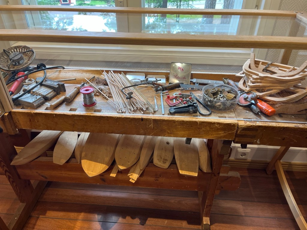 Pienoismallien rakentajan työkaluja ja tarvikkeita. Laivamallirakentaja Åke Sandvall. Linkistä lisätietoa hänestä.