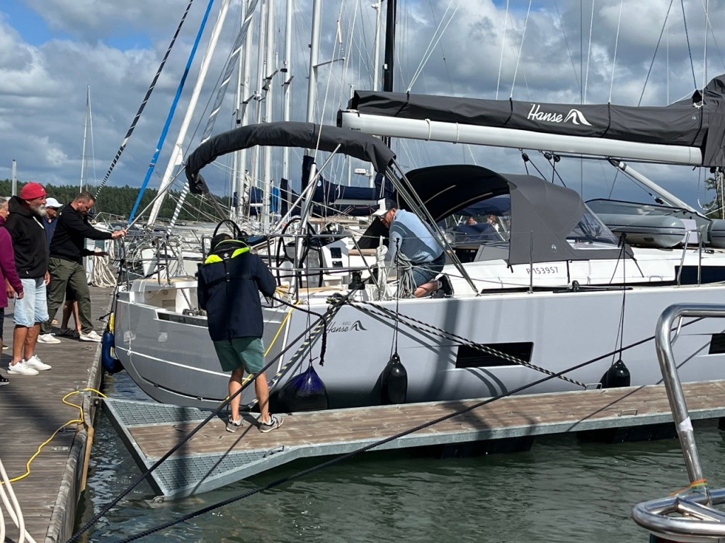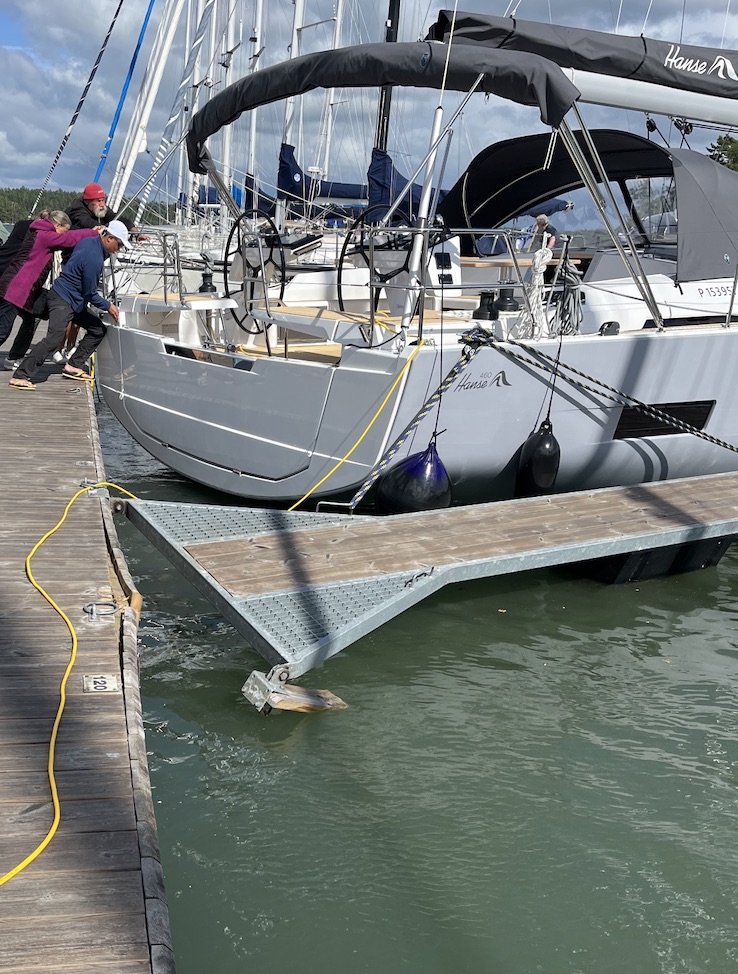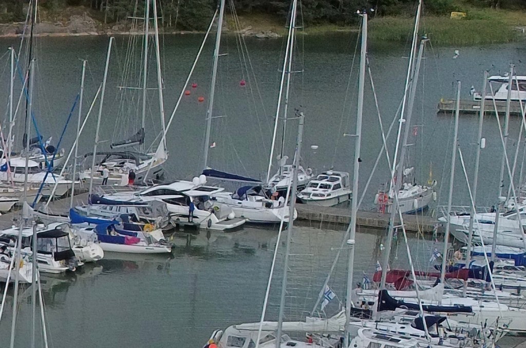 Viereemme tuli purjevene, mutta heillä ei ollut köysiä valmiina. Kova, puuskainen tuuli siirsi veneen naapuriaisaa vasten. Onneksi laiturilla oli porukkaa auttamassa. He pitelivät venettä, ettei olisi hankautunut aisaa vasten. Pienen taistelun jälkeen purkkarin kippari sai peruutettua veneensä pois ja uusi yritys. Nyt oli joitain köysiäkin valmiina, joten kiinnitys avustettuna onnistui.