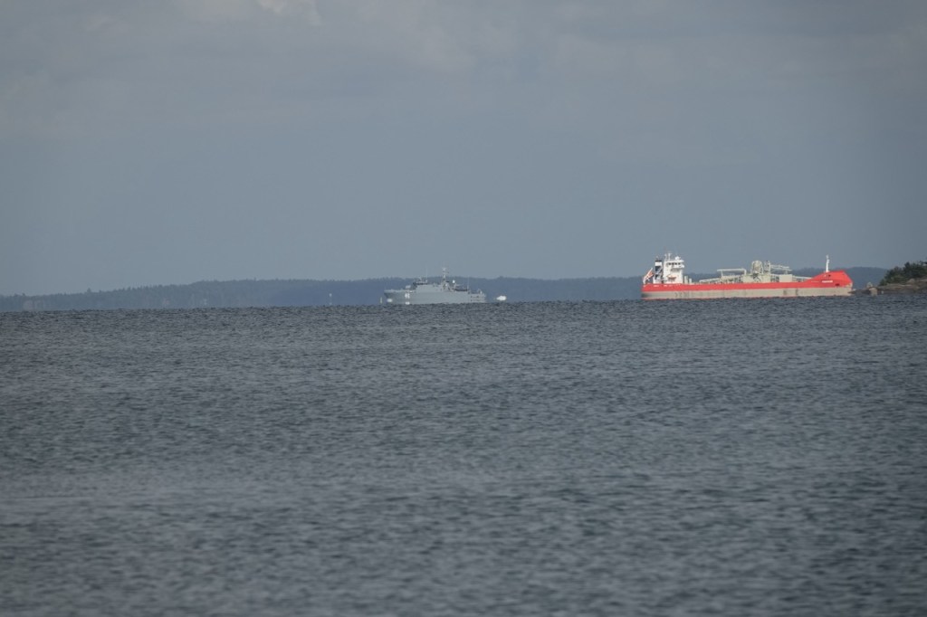 Väylällä liikkui eilen vähän isompiakin aluksia. Rahtilaivaan matkaa n kolme mailia ja sotalaivaan tuplasti.
