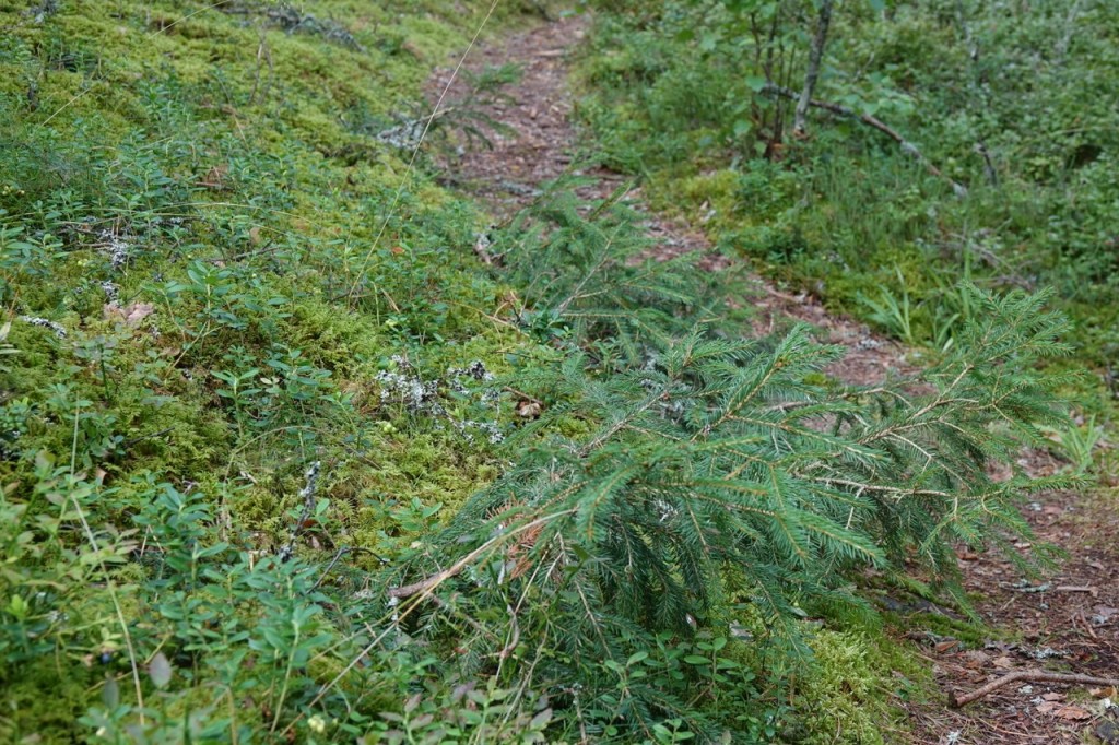 Kuusen oksat kasvavat ali ja läpi sammaleden sekä varpujen. vielä kun vähän pituutta saavat, peittävät koko polun.