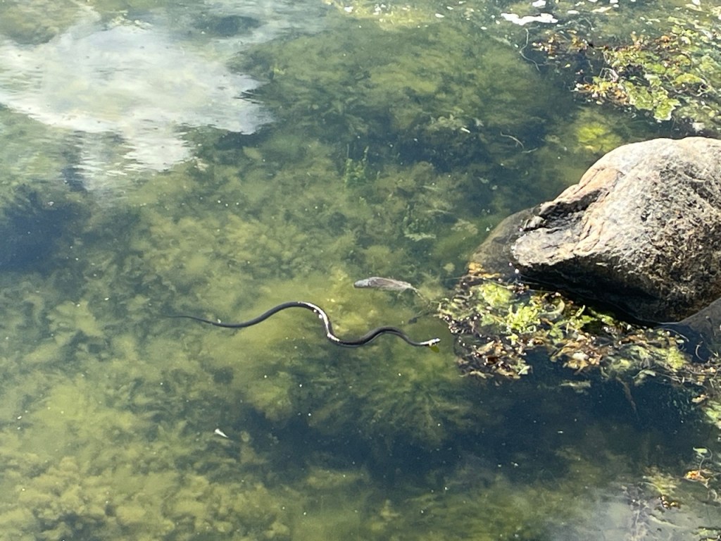 Tämä veijari ei tykännyt yhtään aikeistani. Jähmettyi paikoilleen. Kävin hakemassa kännykkäni, että saisin kuvattua. Oli hävinnyt, mutta kun vähän tömistelin, tuli heti pohjakasvuston seasta katsomaan.