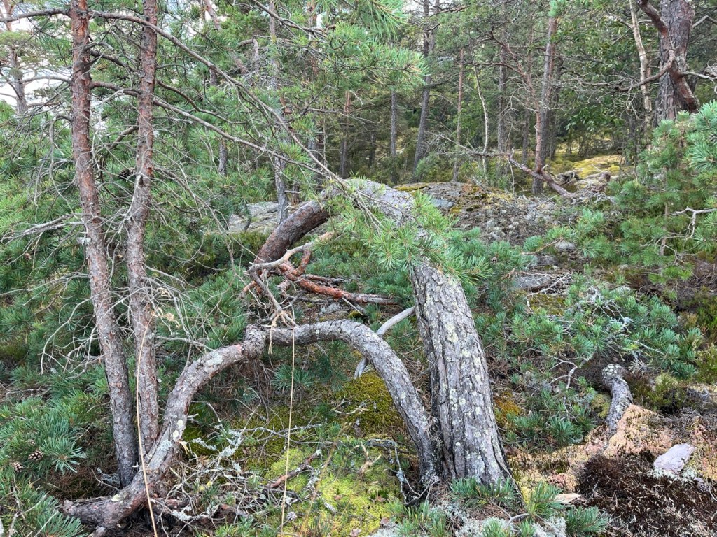 Tällä puolen saarta metsä on mäntyvaltainen. Osa joutuu taipumaan luonnon voimien edessä 😉