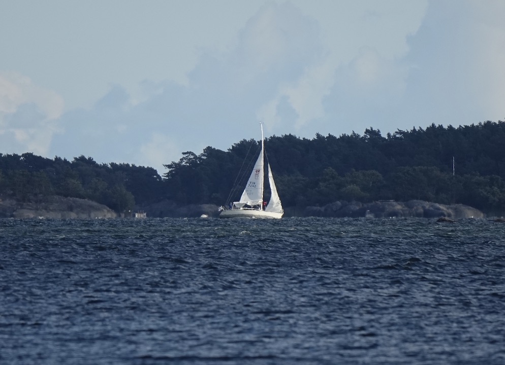 Purjevene menossa ilmeisesti mökille, kun laskee purjeitaan.