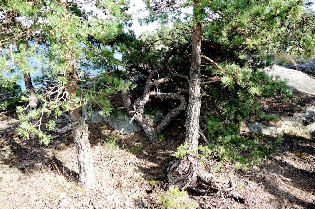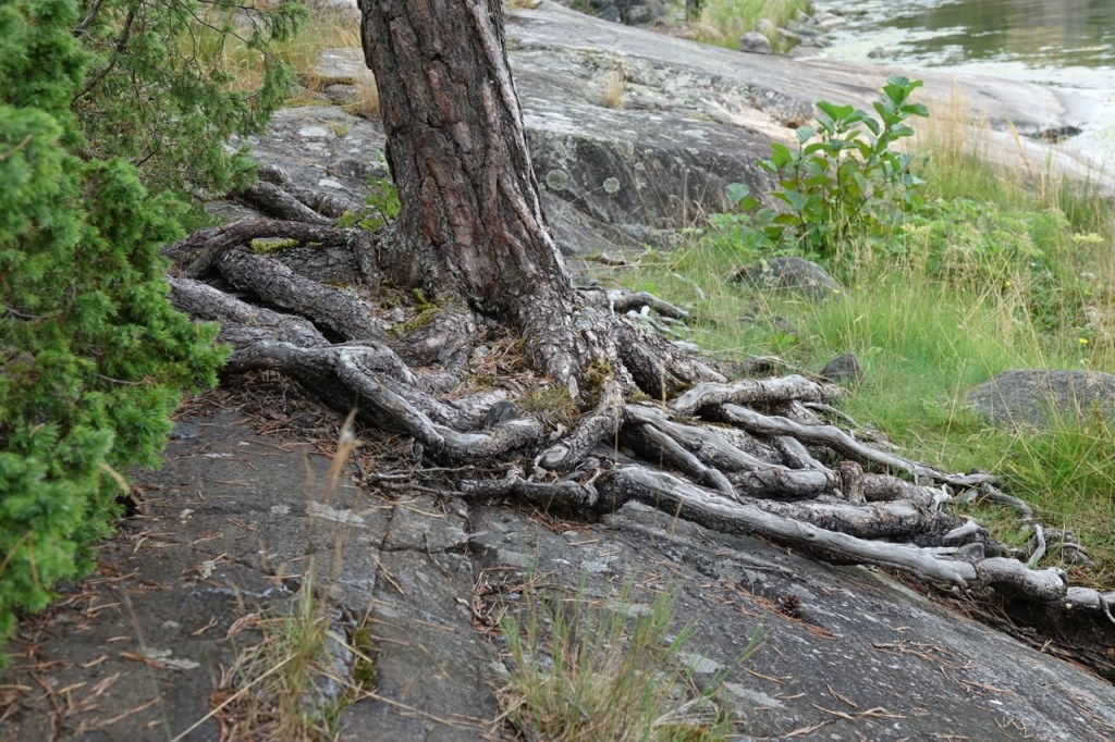 On siinä mänty saanut juurilleen paikkoja hakea. Ihme että pystyssä on pysynyt, kun suurin osa juurista kallion päällä.