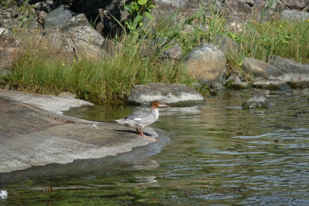 Ammulla tukkasotka lepäili kalliolla Sarzan oikealla puolella. Häiriintyi, kun aukaisin kattoluukun ja poistui uiskentelemaan.
