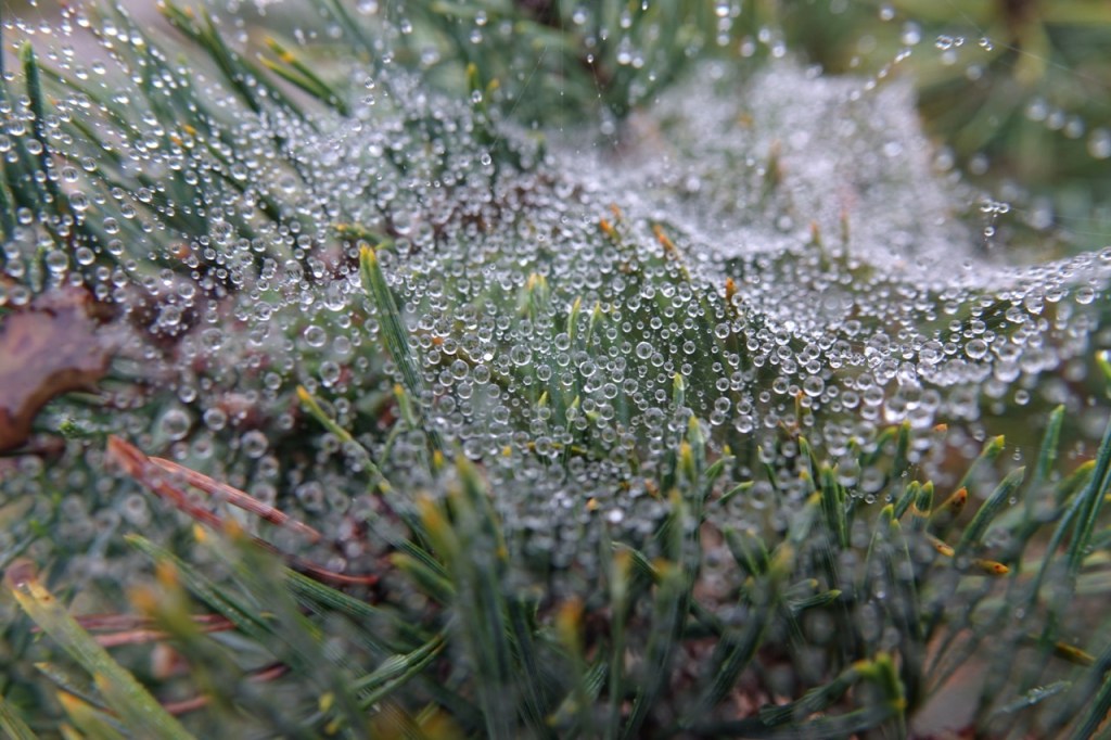 Männyn oksalla hämähäkin syheröön oli tiivistynyt posaroita. Vaikea saada hyvää kuvaa vapaalla kädellä.