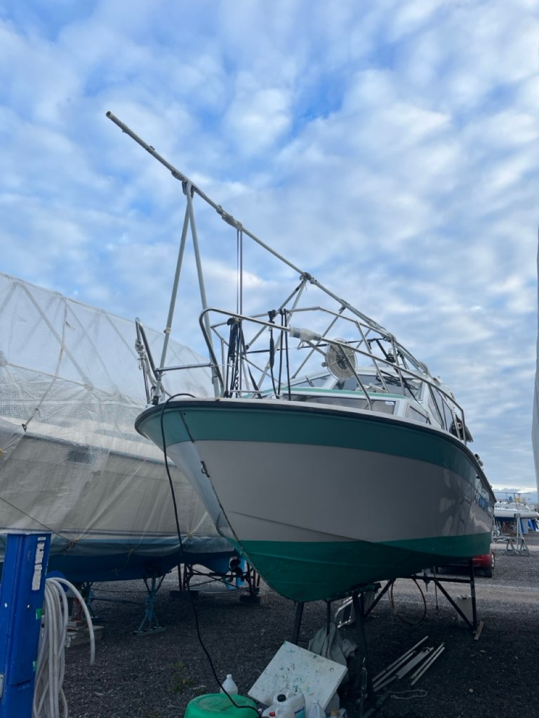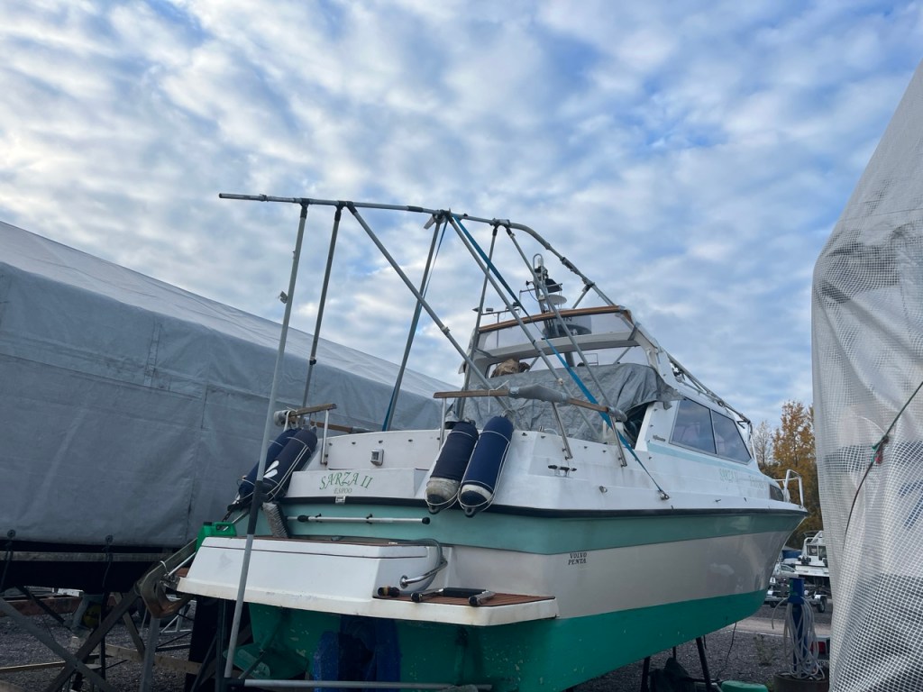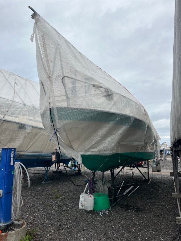 Tuohon taakse tulee vielä yksi pieni pressu niin ettei mahdollinen lumi pääse veneeseen. Mutta se vasta sitten, kun kaikki tavarat ovat veneestä viety kellariin.