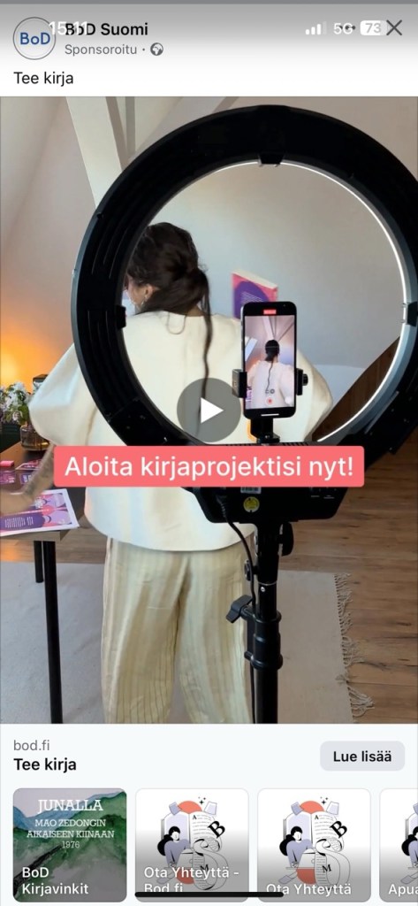 Esimerkkinä tässä on BoD’in mainos Facebookin sivustolta, kuvankaappaus. Kirjani oli alareunassa esillä.
