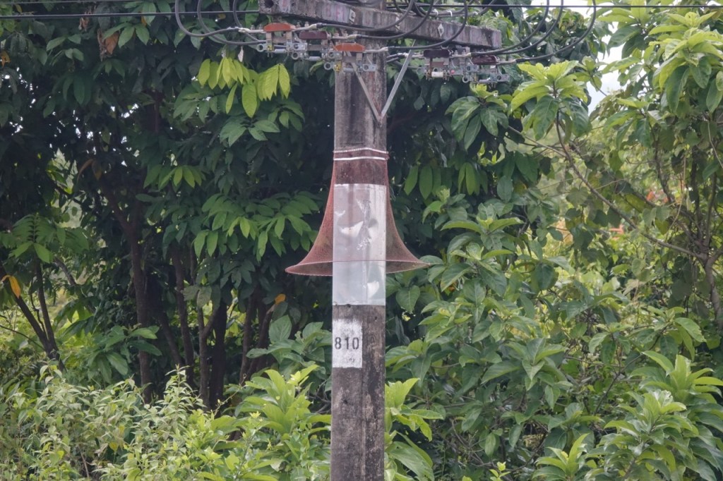 Betoniseen sähkötolppaan oli jyrsijöille tehty kiipeäsin estävä verkko. Eivät pääse muuntajalle asti tekemään tihutöitään.