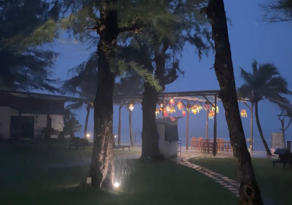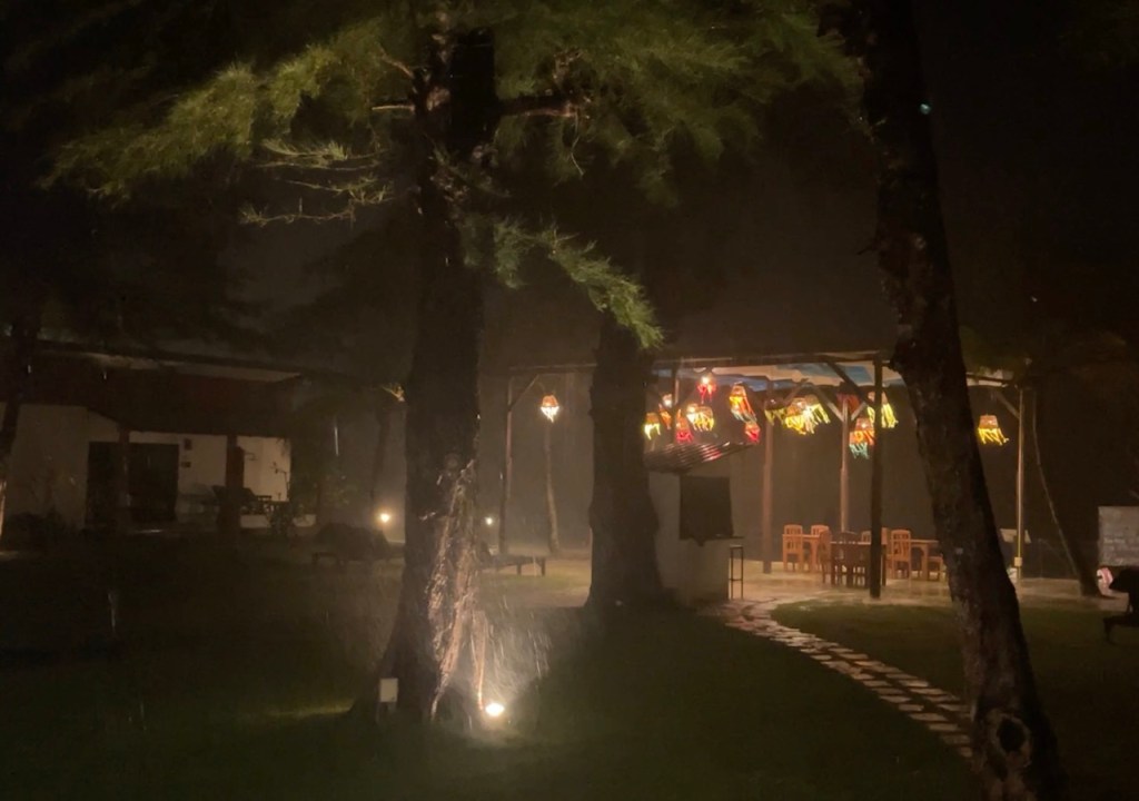 Kun olimme saaneet syötyä ja jälkkäriä odottelimme , repesi taivas.