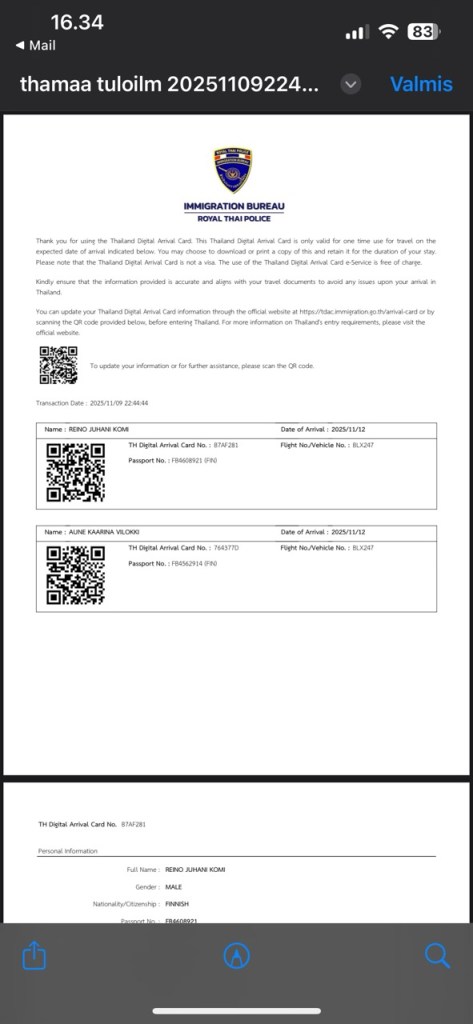 Tullissa sitten saimme jonottaa jonkin aikaa, koska ottivat vielä kaikilta jokaisesta sormesta jäljet ja varmuudeksi vielä kuvan kasvoista. Kyllä meitä nyt sitten on helppo jälistää, jos jotain kolttosia tehdää Thaimaassa.