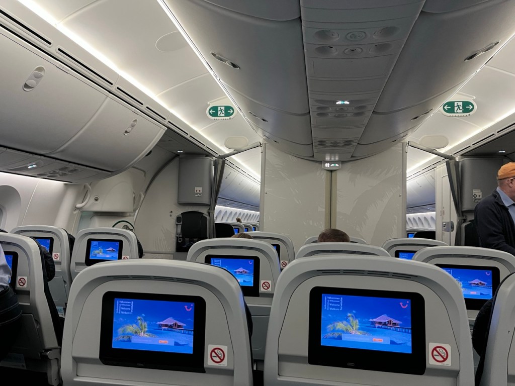 Kone, jolla lensimme, oli Boieng 787 laajarunkotyyppiä. Emme kumpainenkaan olleet lentäneet mies muistiin Boiengilla, joten tuttavuus oli uusi.