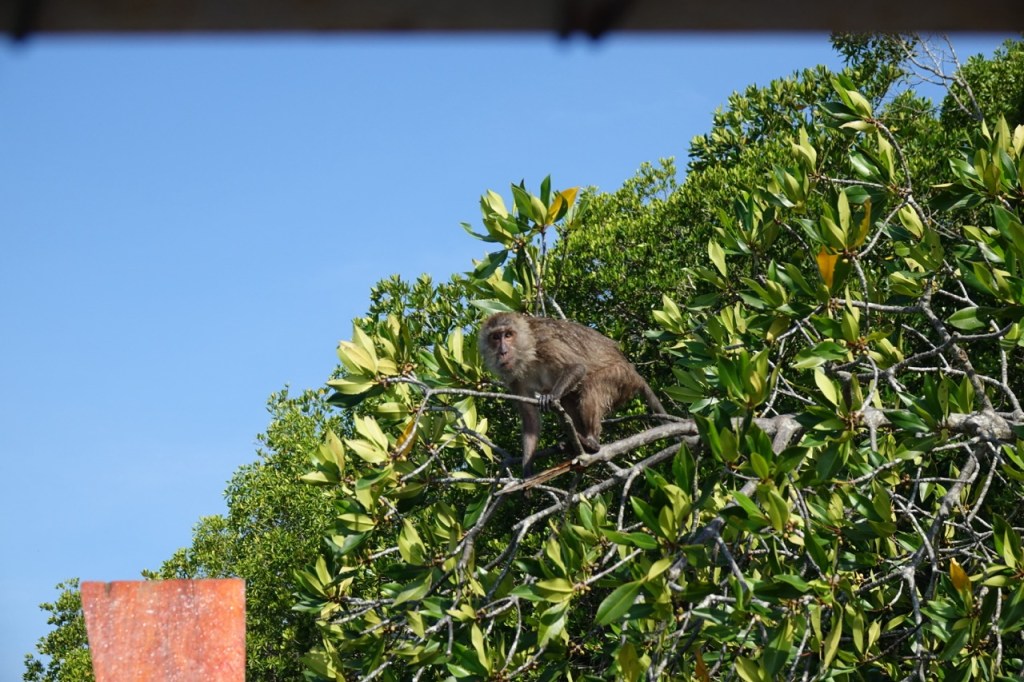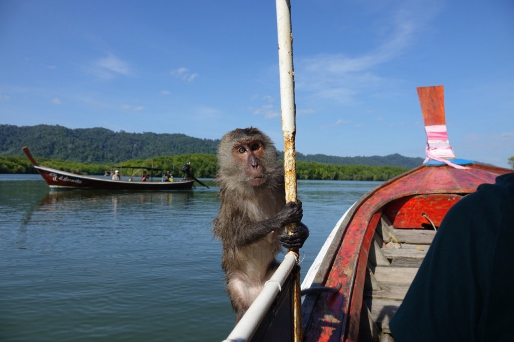 Niin alkoi varsinainen kohteeseen tutustuminen. Kuski ajeli alkumatkan hissukseen ja ohjasi veneen kohti apinoiden valtakuntaa. Yksi daami hyppäsikin meidän kyytiin, jolloin kuski sammutti moottorin ja kaivoi apinoille tarkoitetun evään esille.