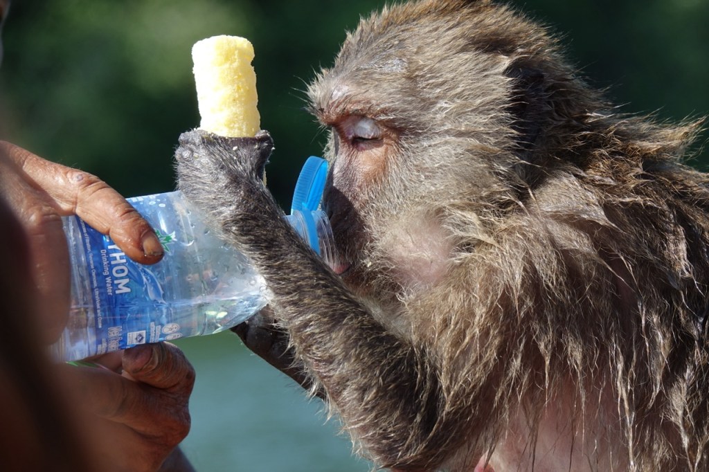 Ei tarvinnut kahta kertaa pyytää neitoa tulemaan eväille. Ja kun oli riittävästi syönyt, antoi kuskimme apinalle vettä.