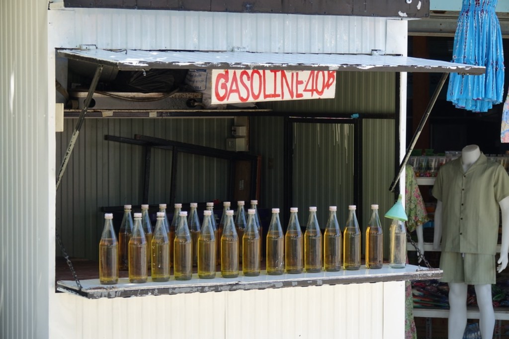 Oli täällä bensamyyntipaikkakin. Mutta enpä ole ennen nähnyt tuon kokoisissa astioissa polttoainetta myytävän. Taitavat olla mopopojille suunnattua myyntiä 😉