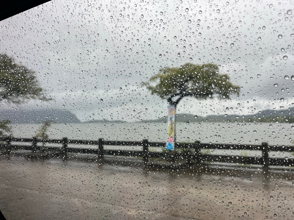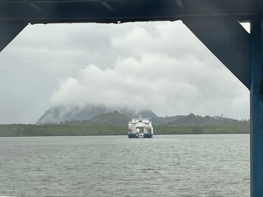 Lauttamatkalta otettu kuva kertoo paljon vallitsevasta kelistä. Pilvet roikkuivat vuoren rinnetä vasten.
